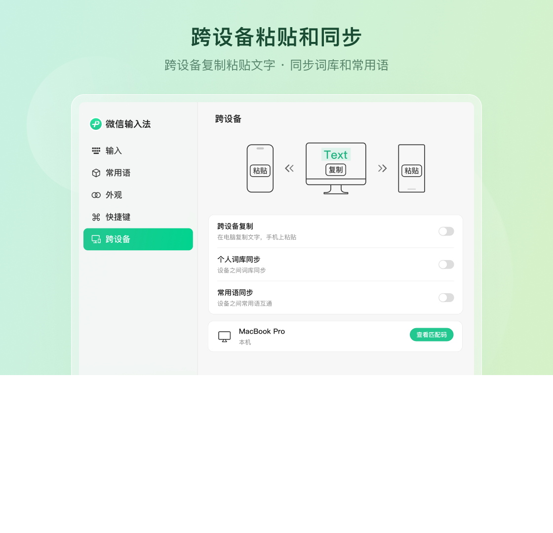 微信输入法是一款跨平台(Windows macOS Android iOS)的智能输入法。支持跨设备复制粘贴、同步词库和常用语。拥有智能输入模式,可精准匹配候选词。你还可以设置常用语、符号配对、符号转换等功能,让你的输入更快、更准。